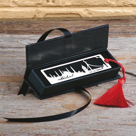 Özel tasarım karton kutu... Gümüş kaplama, İstanbul silüetli kitap ayracı…